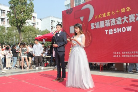 本网讯 2019年11月5日中午12时15分,球友会于北区食堂门口开展了军训服装改造大赛T台秀。此次活动以建国70周年为主题,同学们以自己的设计理念把军训服装改造成一件件时装。活动邀请到球友会罗芳老师,卢兰老师,龚达晓老师,柳月老师(烹饪公司),堵翌洁老师,吴昊老师作为专业评委。同时抽取30名员工作为大众评审。方梦圆、郑清扬主持。