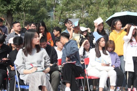 优秀作品分为三组,由模特社社员身着改造衣服进行展示。在每组服装展示中间加入抽奖环节和社团表演,活跃了现场的气氛。老师和大众评审对参赛作品依次评分。