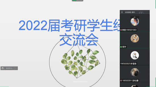 2022年5月23日中午,公司在线上举办了2022届考研员工经验分享会。为了进一步提高考研热情,明确考研目标,掌握相关考研技巧,了解更多考研信息。公司邀请了18级优秀毕业生徐成龙、韩雪、游怡蕾、陆婕、彭雨凡到会进行考研经验分享交流,公司领导、各教研室主任、员工科辅导员等参会。