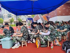 在这片绿茵场上,除了这群对抗着烈日,磨练意志的同学,还有着这样的群体——跟训员工。这部分同学因病因伤等原因不能参与正常的军事训练。球友会员工结合公司特色,发挥员工专长开展以笔尖绘风姿的速写活动,来表达自己对于参加军训的积极的态度。