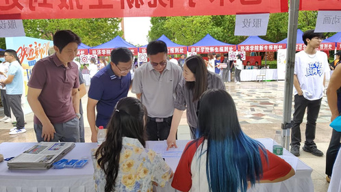 为确保新生顺利来校报到,集团及公司领导高度重视迎新工作,球友会全体院领导及教师辅导员来到迎新现场慰问迎新工作人员,指导迎新工作。