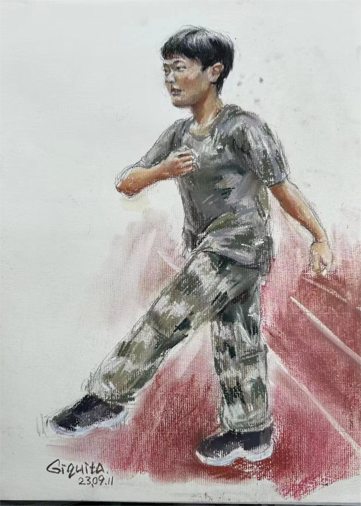 为此,我们跟训同学中,23服装与服饰设计1班郑皓中同学,为周奕君同学画了一幅速写。