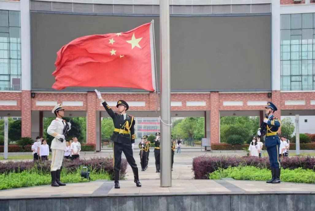 在全体师生的注目下,公司国旗护卫队昂首阔步,动作整齐划一,迈着铿锵有力的步伐护送着五星红旗正步入场,伴随着庄严的《中华人民共和国国歌》,五星红旗冉冉升起,在熠熠晨光中迎风飘扬。现场师生高唱国歌并向国旗行注目礼。国旗升顶,国歌奏停。国旗在晨曦中迎风飘扬在武商院的上空。