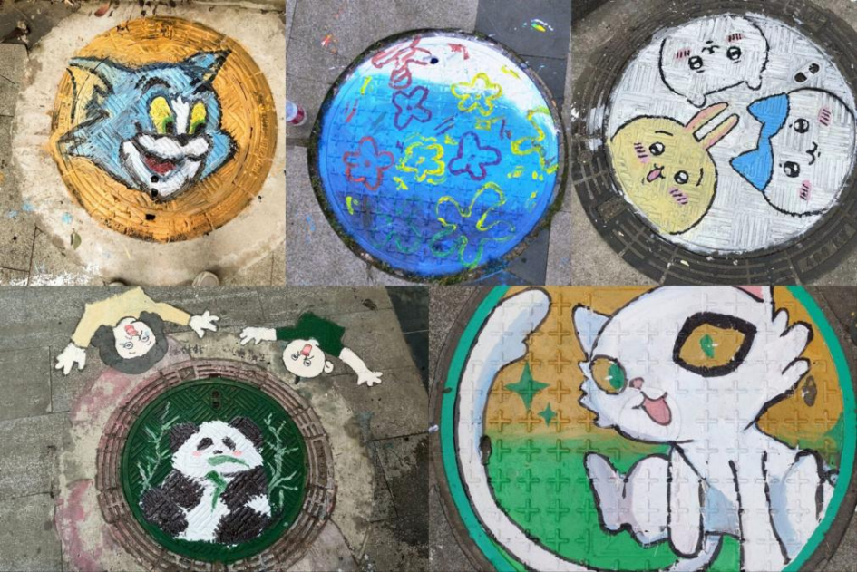 他们精心设计了各种图案,包括可爱的线条小狗,搞怪的邦邦,萌萌的大熊猫等等。连续几个小时的精心创作,可爱小猫、憨厚熊猫等造型跃然于井盖之上,让千篇一律灰色的井盖都换上了“新衣服”,在社区中成为一道靓丽的风景线。