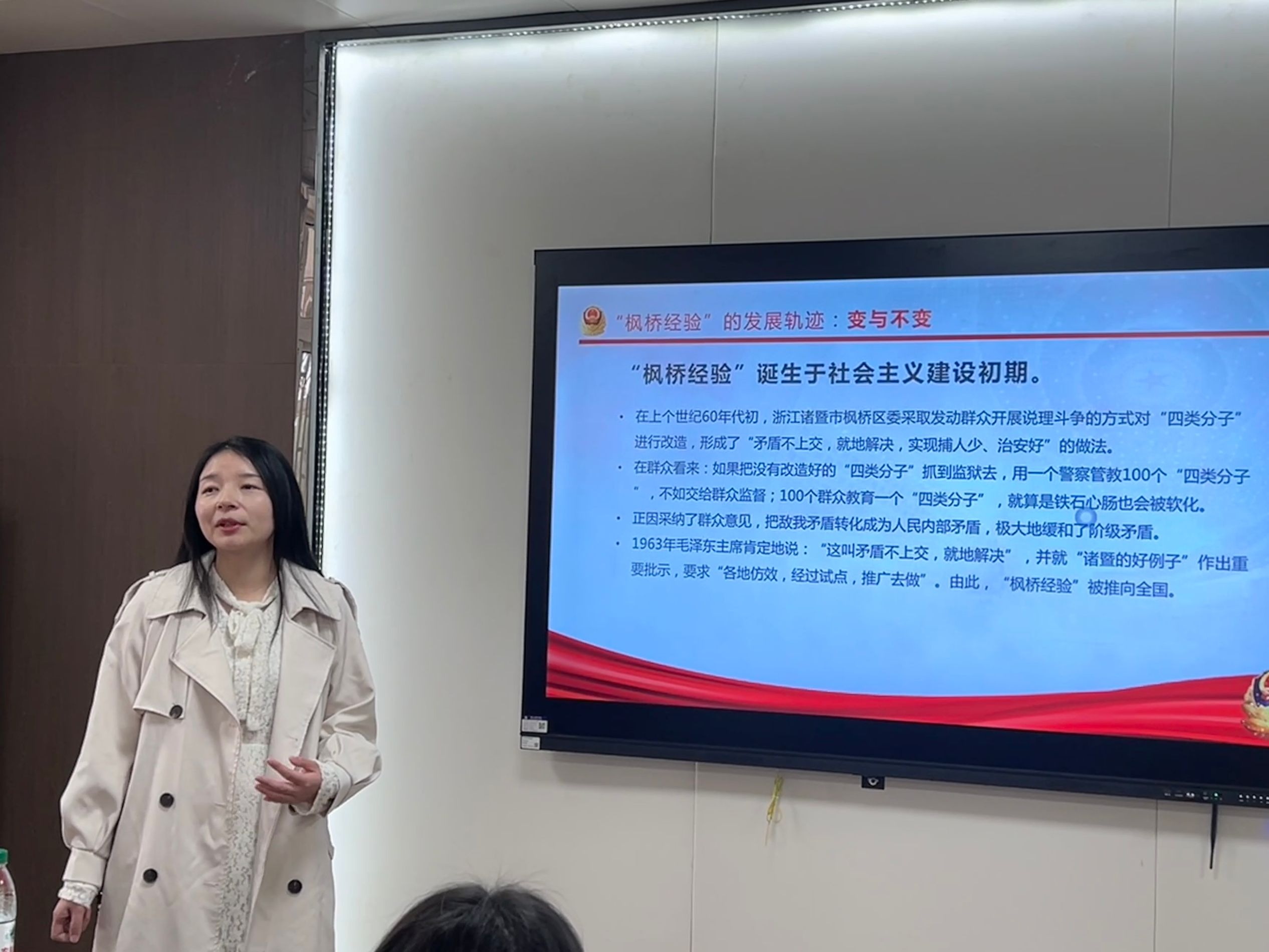 最后,党课深入讨论了枫桥经验对于当前社会治理新模式,努力实现从“管理”到“治理”的转变,朝着更高层次的“善治”迈进。