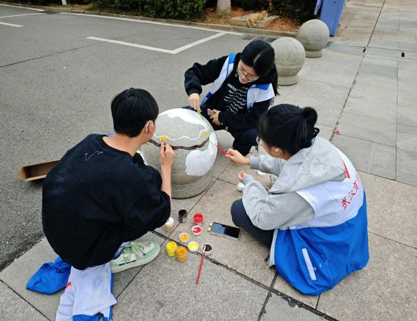 本网讯为提升员工的艺术修养和审美,为校园增添艺术气息,同时又正值新中国成立75周年。2024年11月9日12:15,球友会“艺漾青春”专业志愿服务队组织30余名志愿者在致远广场开展了“石韵流光,彩绘武商”石墩彩绘活动。