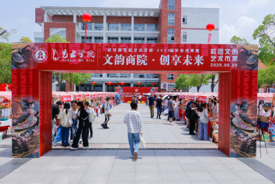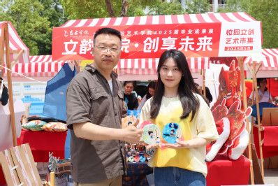 《青绿之间》展台,蓝白交织的扎染作品被精心陈列,深浅不一的晕染,起伏的褶皱,都述说着传统扎染工艺与现代时尚设计的美妙邂逅。《溪游记》展台则将文创与乡村振兴紧密相连,武当山贡茶、竹溪魔芋面、房县小花菇……一件件家乡特产被巧妙融入毕业作品。“我想用插画的形式来反映出家乡特产的特色,为乡村振兴的建设注入动力,展现家乡的每一幕新变化。”动画专业毕业生朱漪镝介绍自己的思路。不少摊位前,师生们了解创意背后的故事,现场交易的同时,还可以将自己的想法与“摊主”沟通,预订自己的创意产品。