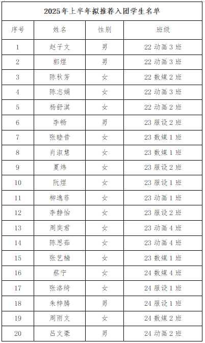 为进一步加强团的组织建设,规范团员发展工作,保证新发展团员的质量,根据《中国共产主义青年团章程》和《中国共产主义青年团发展团员工作细则》的相关规定,经个人申请、入团积极分子评分细则、团支部推荐、分团委审查等综合考评,经商议,拟发展赵子文等20名同学加入共青团,现将名单予以公示(排名不分先后)。