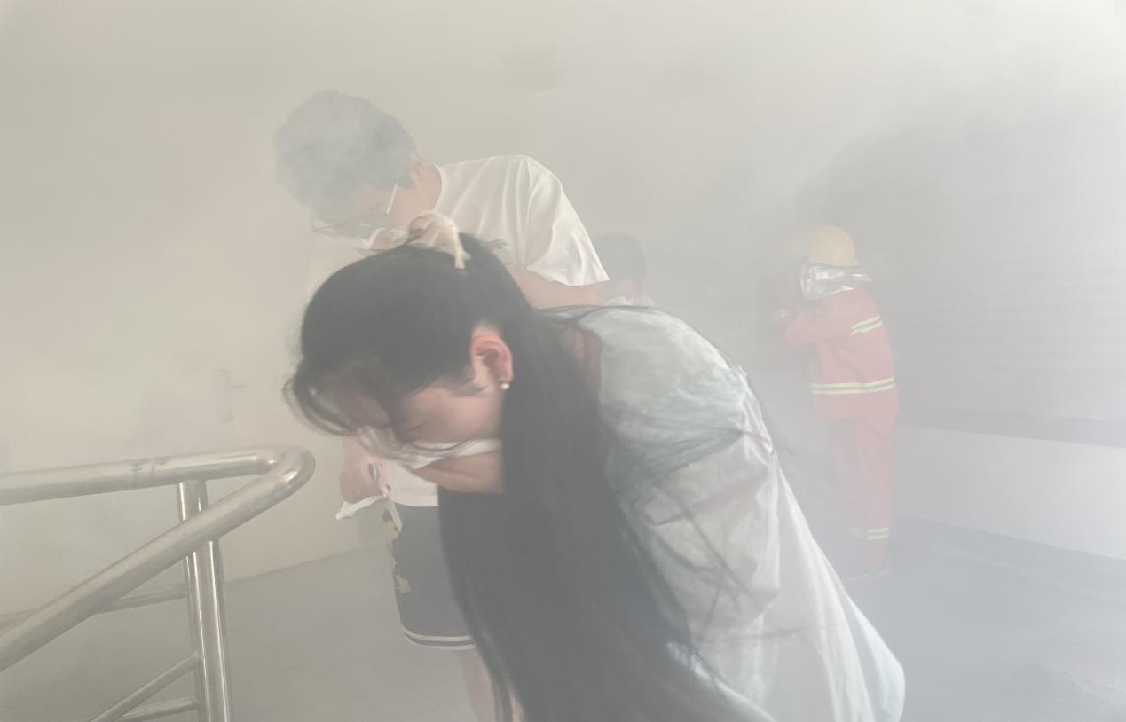 消防逃生演练环节,模拟烟雾环境,师生严格依照流程,以湿毛巾捂口鼻、低姿有序撤离,沉浸式强化避险实操能力。